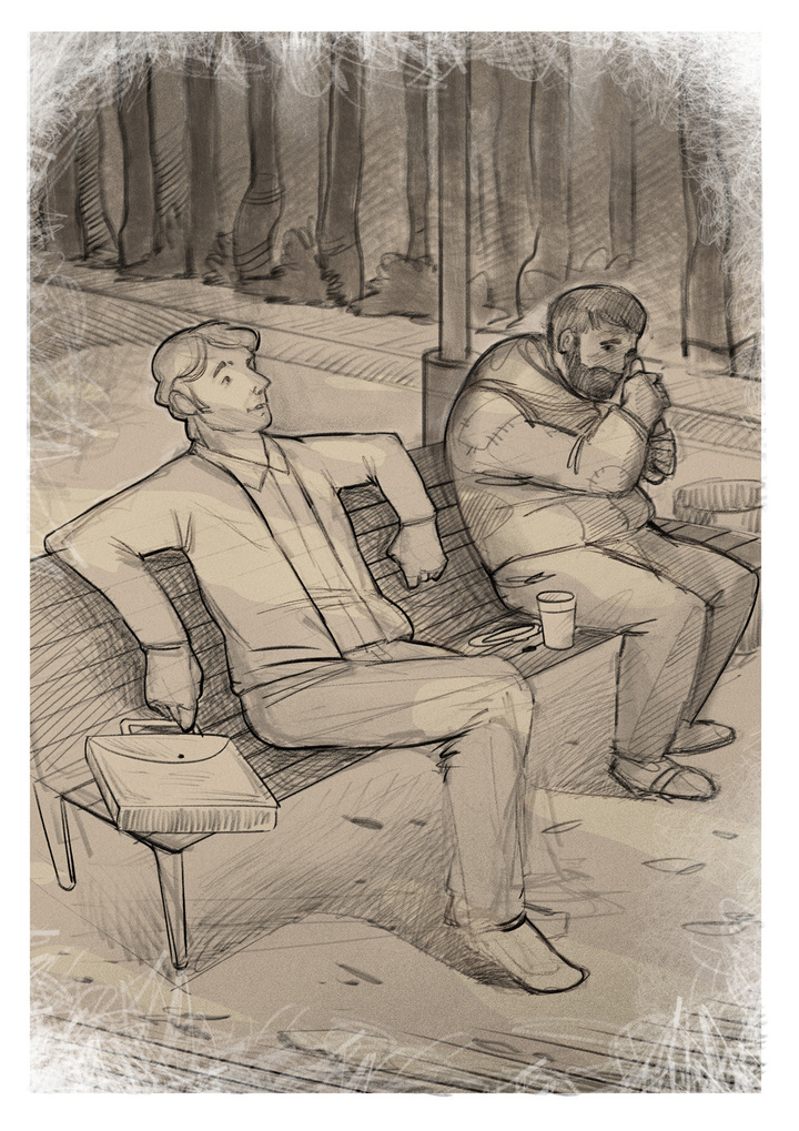— Послушай, братан, — открыл глаза бомж, — ты, я вижу, добрый человек и при деньгах, займи рублей сто, с тебя не убудет, а я сигарет хоть прикуплю.