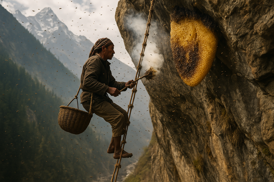 Мед добывают народности гурунг в Непале — потомки древних горных племен, которые веками практикуют этот промысел. Их охотники за медом, вооруженные лишь веревочными лестницами и дымом, спускаются со скал высотой до 300 метров, где обитают гигантские гималайские пчелы (Apis laboriosa).